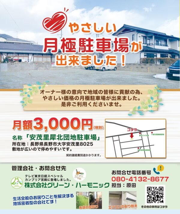 長野市安茂里に新しい月極駐車場『安茂里犀北団地駐車場』が出来ました。